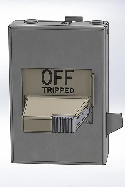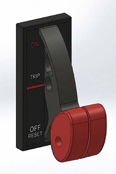 Current GE MCC design with characteristic curved handle. Handle mechanism is spring-loaded and pulls outward to release.